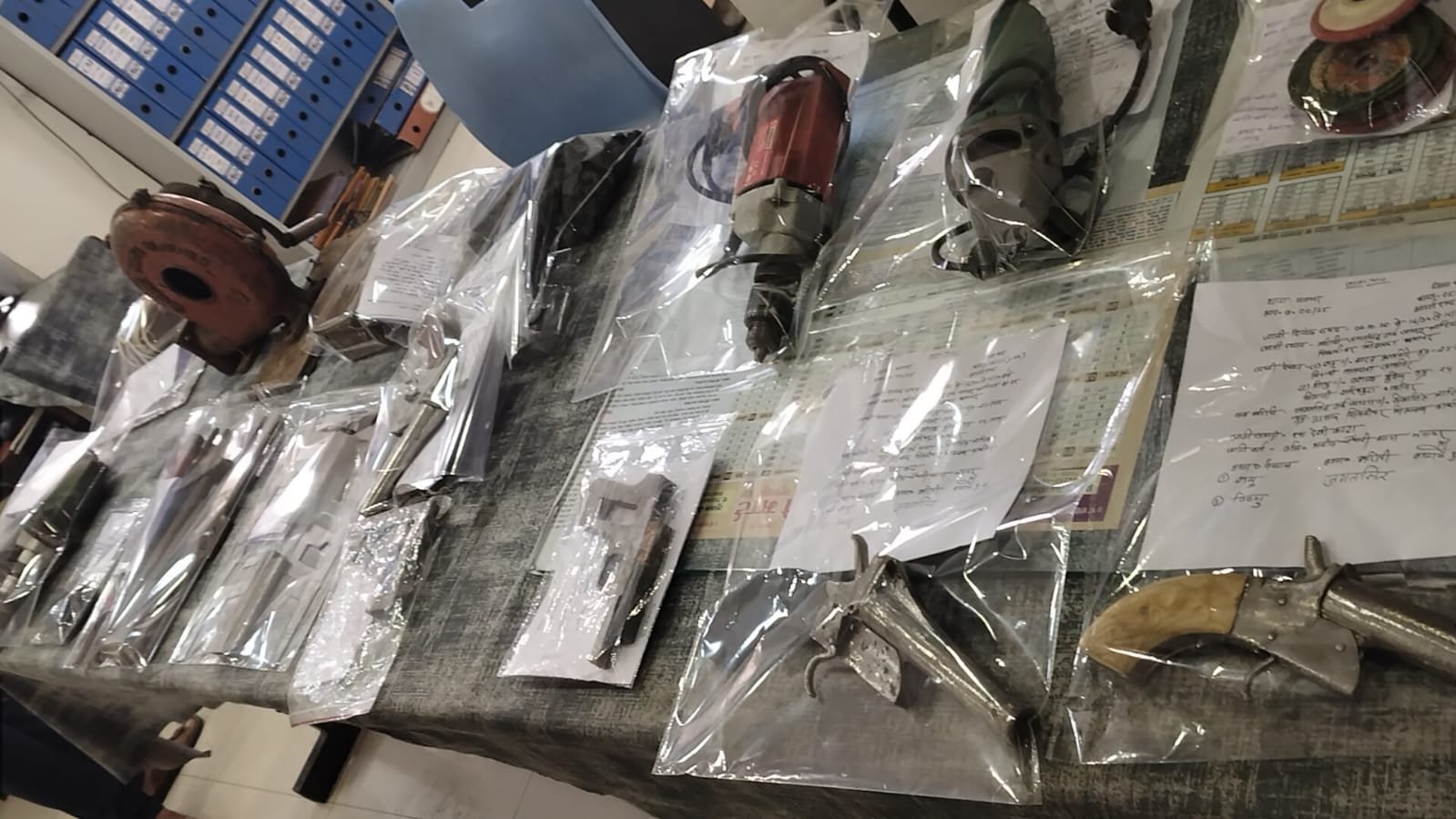 आरोपी आजाद सिंह के कब्जे से 01देशी कट्टा , 01 अधबनी पिस्टल, 03 अधबनी मैग्जीन के टुकडे , 04 पिस्टल के फर्मे, 01अधबनी बेरल, 02 लोहे कीहथोड़ी ,02 लोहे की कानस, 01 इलेक्ट्रीक बोर्ड,01 लोहे का गत्ता ,01 कोयलासीगड़ी का हाथ पंखा , करीबन 500 ग्राम कोयला , 02 लोहे की संडासी , 05 ग्लाईंडरमशीन के पत्ते ,01 पीस्टल ग्रीप पर लगाने की प्लास्टीक की प्लेट , 01 सुम्बा,01 लोहे की डाई,02 स्प्रींग, 01 ड्रील मशीन ,02 ग्लाईंडर मशीन, 01 प्लायर,जप्त कर थाना मनावर पर अपराध क्र.645/25धारा 25,25(1-aa) आर्म्स पंजीबद्ध किया गया।